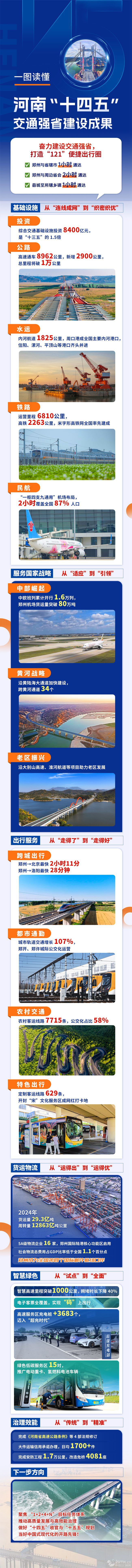 人民網(wǎng)鄭州10月14日電 (程明輝)跨城出行“拎包走”、都市通勤“像串門”、個(gè)性出行“特色足”……10月13日,河南省舉行“十四五”系列主題新聞發(fā)布會(huì),會(huì)上披露,“十四五”以來,河南交通強(qiáng)省建設(shè)邁出堅(jiān)實(shí)步伐,一個(gè)更高效、更智能、更暖心的中原綜合立體交通網(wǎng)正逐步成型。 “鄭州與省轄市1小時(shí)通達(dá)、鄭州與周邊省會(huì)城市2小時(shí)通達(dá)、縣城至所轄鄉(xiāng)鎮(zhèn)1小時(shí)通達(dá),全省‘121’便捷出行格局基本形成。”河南省交通運(yùn)輸廳黨組書記、廳長(zhǎng)付磊介紹,“十四五”期間,河南綜合交通基礎(chǔ)設(shè)施投資將達(dá)8400億元,是“十三五”的1.5倍,全省綜合交通網(wǎng)總規(guī)模達(dá)29.2萬公里。 公路方面,高速公路通車?yán)锍桃堰_(dá)8962公里,“十四五”新增里程超2900公里,年底將突破1萬公里,90%以上的縣邁入“雙高速”時(shí)代。普通干線公路新改建4500公里,實(shí)現(xiàn)重要節(jié)點(diǎn)二級(jí)及以上公路連通。農(nóng)村公路也成績(jī)斐然,新改建4萬公里,“四好農(nóng)村路”全國示范縣達(dá)23個(gè)。 水運(yùn)方面,河南內(nèi)河航道里程達(dá)1825公里,周口港成為全國內(nèi)河主要港口之一,2024年全省完成港口吞吐量6085萬噸、集裝箱10.9萬標(biāo)箱,比“十三五”末分別增長(zhǎng)1倍、12倍。 鐵路民航同樣蓬勃發(fā)展,鐵路運(yùn)營里程達(dá)6810公里,其中高速鐵路2263公里,率先建成“米”字形高鐵網(wǎng)。全省形成“一樞四支九通用”機(jī)場(chǎng)布局,航空運(yùn)輸2小時(shí)內(nèi)覆蓋全國87%以上人口。 在服務(wù)重大戰(zhàn)略方面,河南積極作為。“鄭州-盧森堡”“鄭州-吉隆坡”雙樞紐發(fā)力,中歐班列(鄭州)累計(jì)開行16000列,鄭州航空港區(qū)建成內(nèi)陸首個(gè)國際公路運(yùn)輸集結(jié)中心。同時(shí),沿黃陸海大通道加快建設(shè),跨黃河運(yùn)輸通道達(dá)34個(gè),沿大別山高速等項(xiàng)目建成通車,為老區(qū)發(fā)展注入新動(dòng)能。 便捷群眾出行也是河南交通發(fā)展的重點(diǎn)。跨城出行“拎包走”,鄭州到北京最快2小時(shí)11分,到洛陽高鐵28分鐘直達(dá)。都市通勤“像串門”,城市軌道交通運(yùn)營里程增加220公里,鄭開、鄭許城際公交化運(yùn)營,通勤成本降低近一半。農(nóng)村交通“有保障”,開通農(nóng)村客運(yùn)線路7715條,公交化運(yùn)營占比58%。此外,全省新增定制客運(yùn)線路629條,“交通+醫(yī)療”等特色服務(wù)不斷創(chuàng)新。 在貨物運(yùn)輸方面,河南正由“內(nèi)陸腹地”向“物流樞紐”加速轉(zhuǎn)變。2024年全省累計(jì)完成貨運(yùn)量29.3億噸、貨運(yùn)周轉(zhuǎn)量12863億噸公里,比“十三五”末分別增長(zhǎng)34%、48%。郵政快遞也進(jìn)階提質(zhì),2024年完成郵政行業(yè)業(yè)務(wù)收入727.3億元、快遞業(yè)務(wù)量90.5億件,比“十三五”末分別增長(zhǎng)79%、192%。 智慧綠色發(fā)展同樣亮點(diǎn)紛呈。智慧高速里程突破1000公里,智慧擴(kuò)容試點(diǎn)路段改造后擁堵總時(shí)長(zhǎng)有望下降40%。綠色交通方面,城市公交基本實(shí)現(xiàn)新能源化,全省高速公路服務(wù)區(qū)新增充電樁3683個(gè),邁入“超充時(shí)代”。 一圖讀懂河南“十四五”交通強(qiáng)省建設(shè)成果